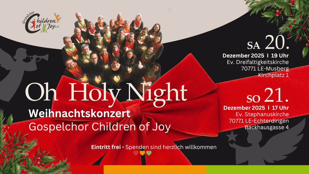 Dreifaltigkeitskirche Musberg Kirchplatz 2, Leinfelden-EchterdingenDie Children of Joy live erleben – beim Familiengottesdienst in der Dreifaltigkeitskirche von Musberg! Wir freuen uns wie immer darauf, in unserer Heimatkirchengemeinde den Gottesdienst mit unserer Musik festlich zu umrahmen.